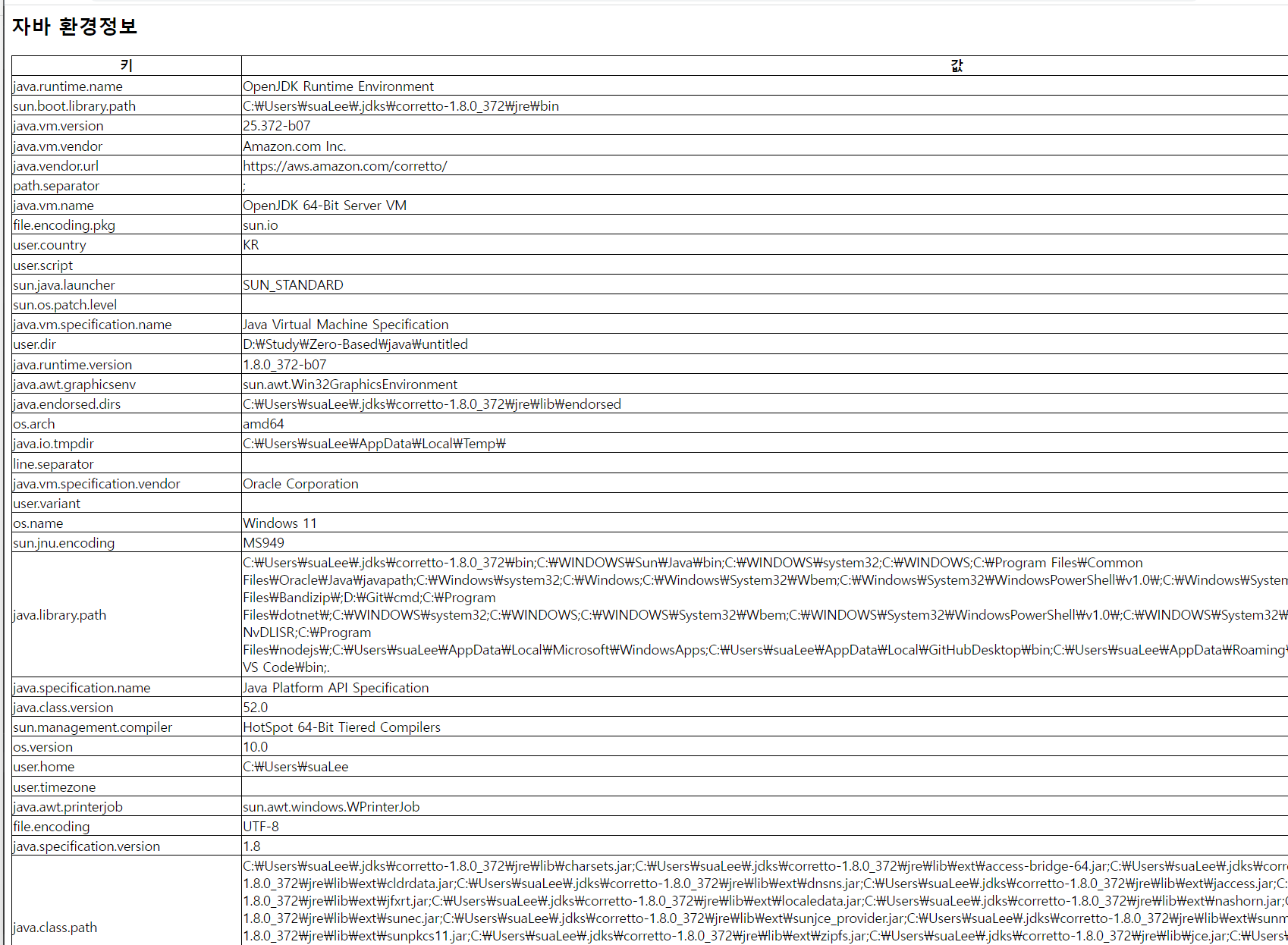 <tr><td>sun.boot.library.path</td><td>C:\Users\suaLee\.jdks\corretto-1.8.0_372\jre\bin</td>