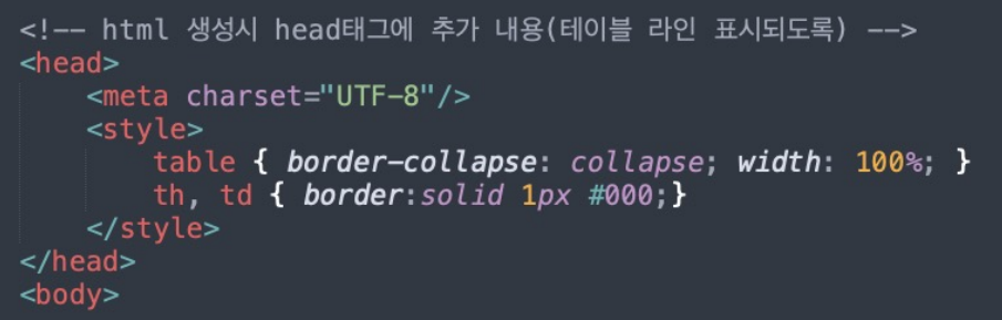 [조건] 자바의 시스템 속성과 파일 저장 코드는 샘플 코드를 참조해 주세요. 출력결과의 파일은 웹브라우저로 확인해서 정상적으로 표시되어야 합니다. html파일을 작성할 때 테이블에 라인이 표시되도록 head 태그에 style태그 추가(샘플 코드 참조)