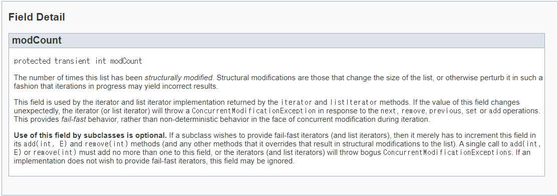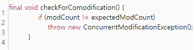 즉, ArrayList.Iterator() 함수를 통해 생성된 Iteraotor는 자신이 생성될 때의 modCount 를 저장하고,