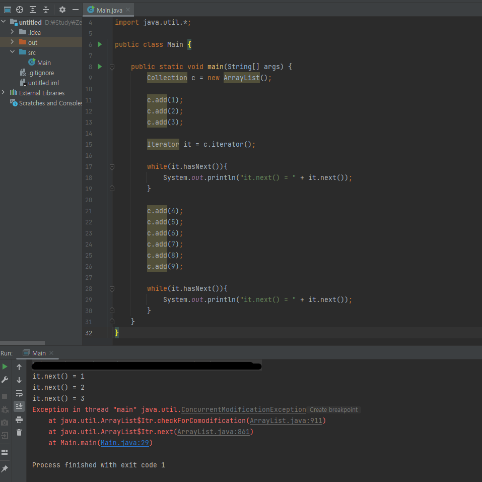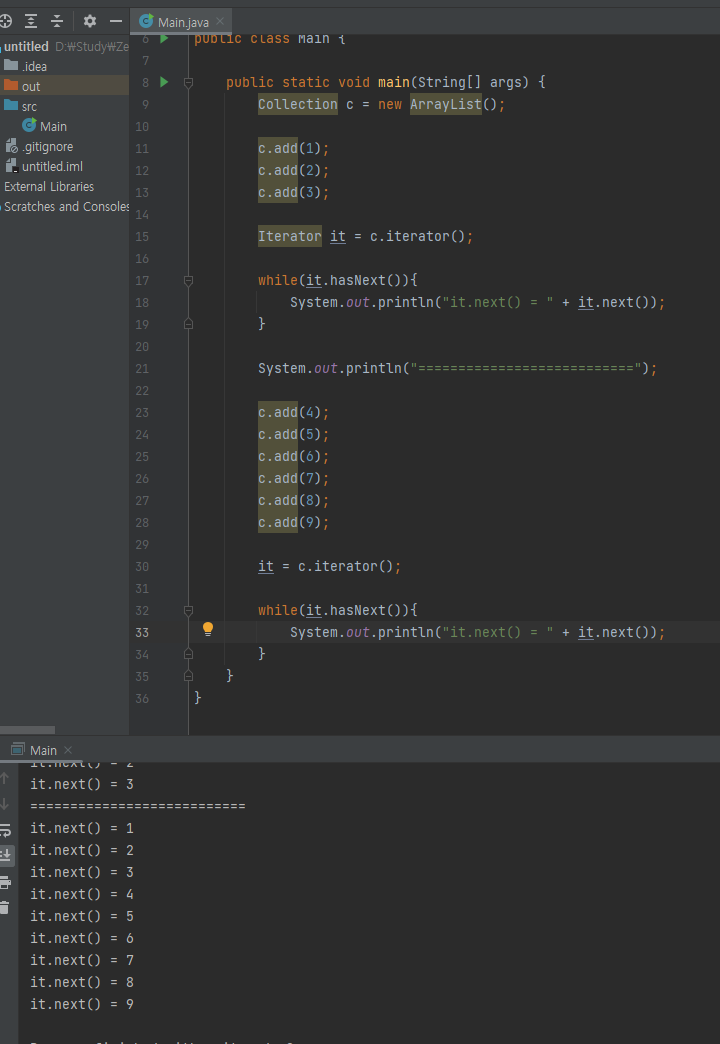 2. Iterator 객체가 생성될 때 Collection 객체의 주소값이 아니라 모든 값을 복사하여 처리한다. 그래서 후에 Collection에 element를 add하여도 Iterator 객체에서 참조하는 Collection의 값은 변함이 없다.