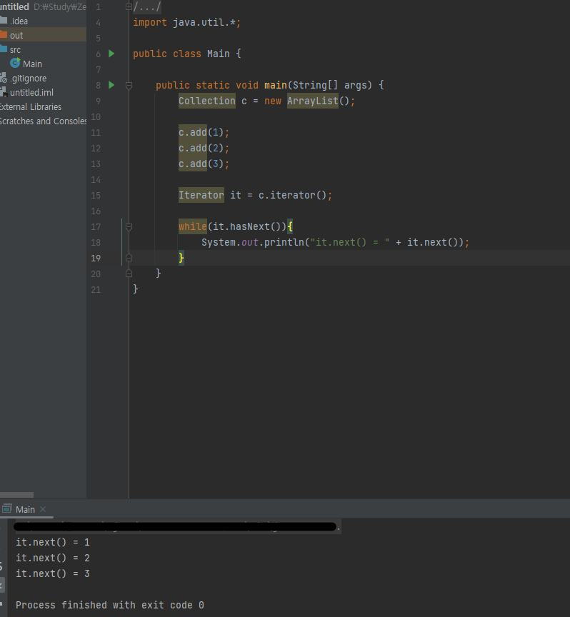 3개의 데이터를 넣고 hasNext() 함수의 return 값이 fasle가 나올 때까지 출력하는 예제를 따라해보았다.